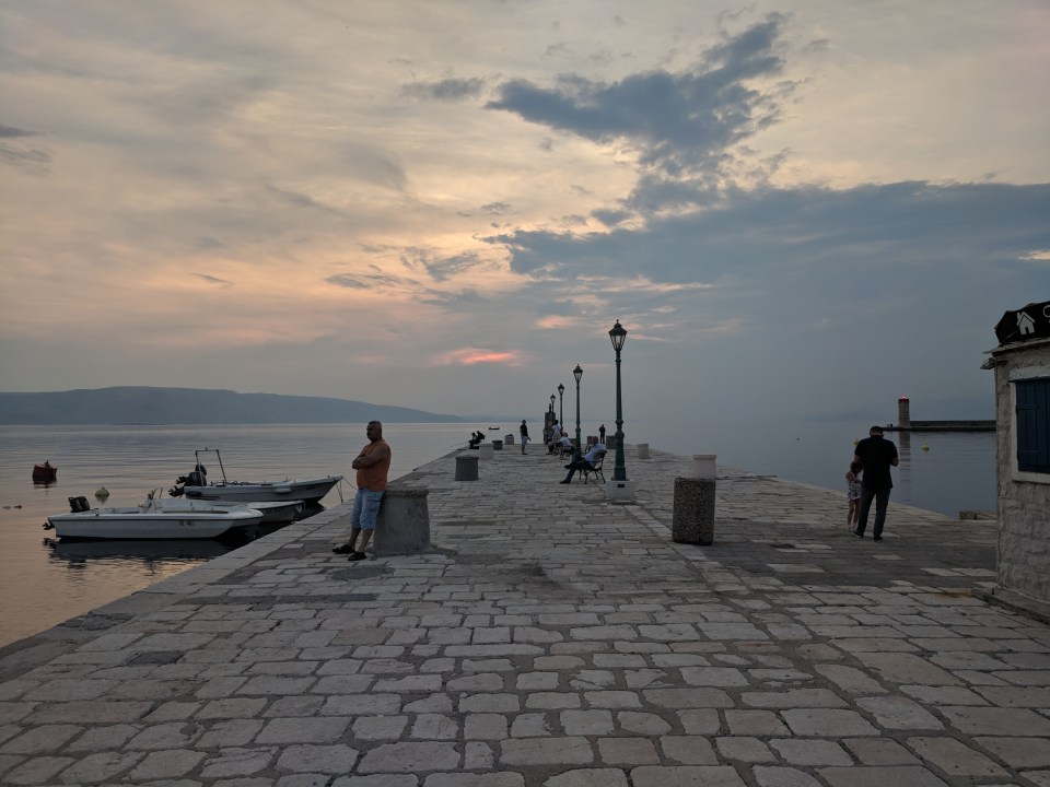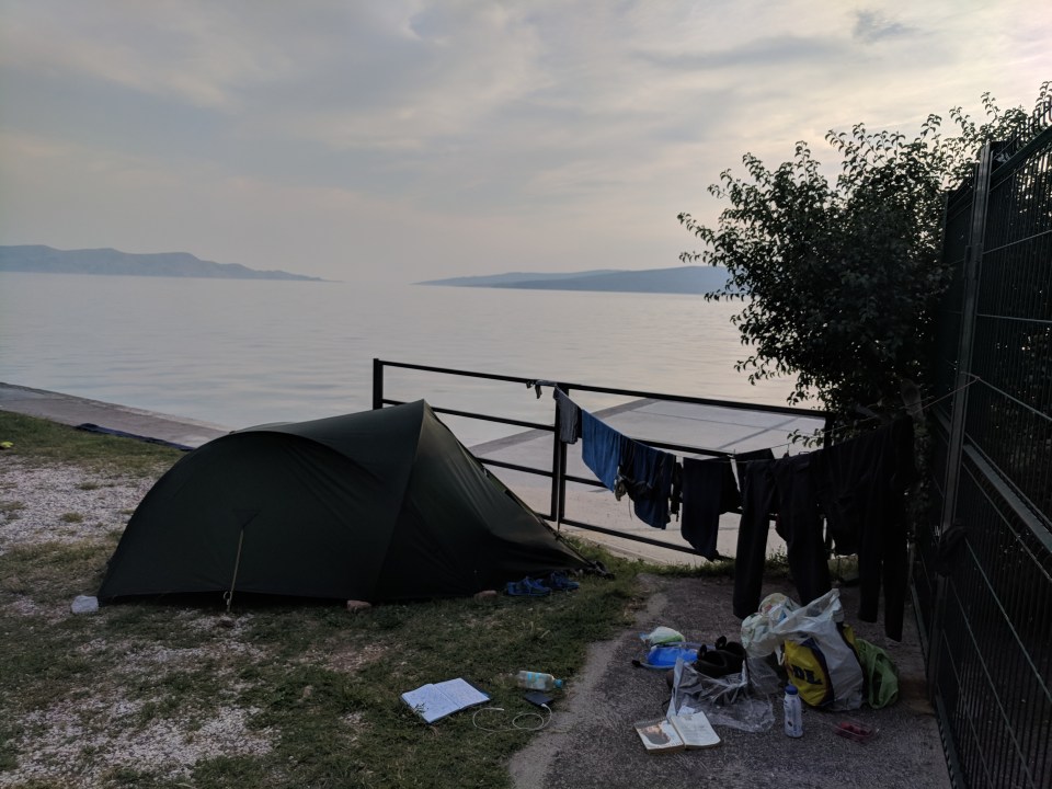 Our campsite in Senj as the sun sets over the Adriatic.