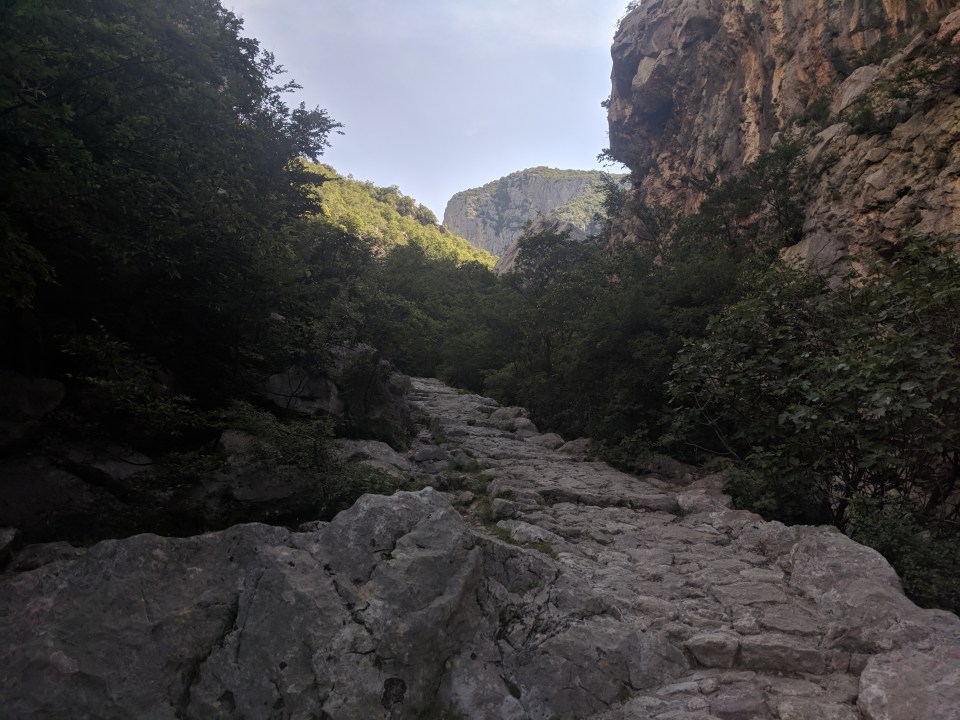 We slept well, and set off early the next day on the easy, if steep, climb up Velika Paklenica canyon. This is a popular area, and the path is so well made it almost felt like a theme park, complete with gift shops and restaurants. Three-hundred metre limestone cliffs towered to either side, with rock climbers dotted on the crags like watchful gargoyles.