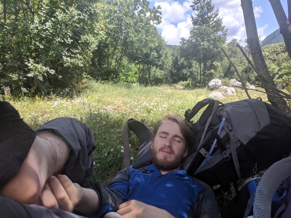 As a lifelong vegetarian, I’m not very good at digesting meat, so the spoonful I had was enough to make me queasy, and I called for a post-lunch siesta just a few hundred metres from the hut. A sign said we only had three hours walking left, so we happily napped in a meadow for an hour as my stomach recovered. Some gummy dinosaurs helped.