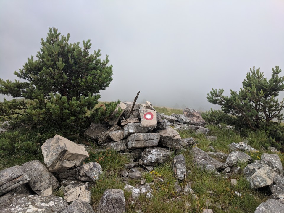 I know we’ve complained about them a lot, but the red and white dots which mark hiking trails in this part of the world can really be infuriating. When they’re good they’re great, but having a heavily faded mark on some obscure rock every hundred metres can make the trail harder to follow than if we just used a map: you have to pause every few minutes to scour the scenery for the next marker, making dense forests slow going. So it was after lunch when we finally arrived at Svinjar peak, and by then the sky had broken open to pour its cold rain down on us. We didn’t linger – all we could see was fog.