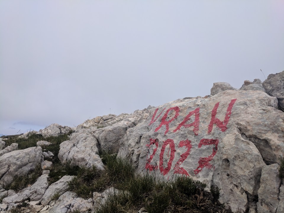 After about 500 m of climbing, we reach the ridge. The dwarf pines are not so thick here. Instead, we see limestone outcrops and tufts of alpine grass. The weather is fine but the winds threaten to blow us off the top, so we hunch over and make our way slowly to Mali Vran. When we get there, it’s very scrubbly. There’s not even a stick to mark it! But we don’t mind. The view is beautiful, the walking supreme and we have some bigger fish to admire.
