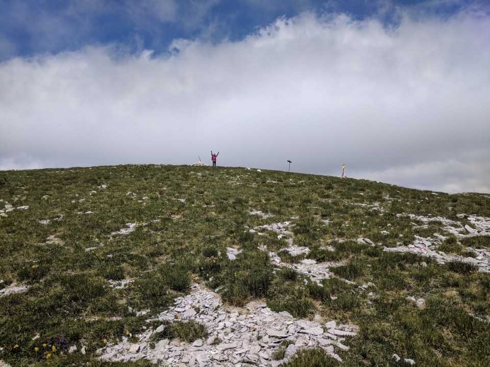 The track just past Vran is a different beast – more technical, steeper, with lots of scree. But it’s a really nice walk. It funnels us into tiny grassy corridors between the dwarf pines, where I imagine the snow drifts settle and slide down like miniature glaciers. After a while, having come up and over the small peak of Bijela glava (for some reason not good enough for the family name), the track mellows and we swan along through flat grassy meadows. A few more hundred metres and I’m at the summit!