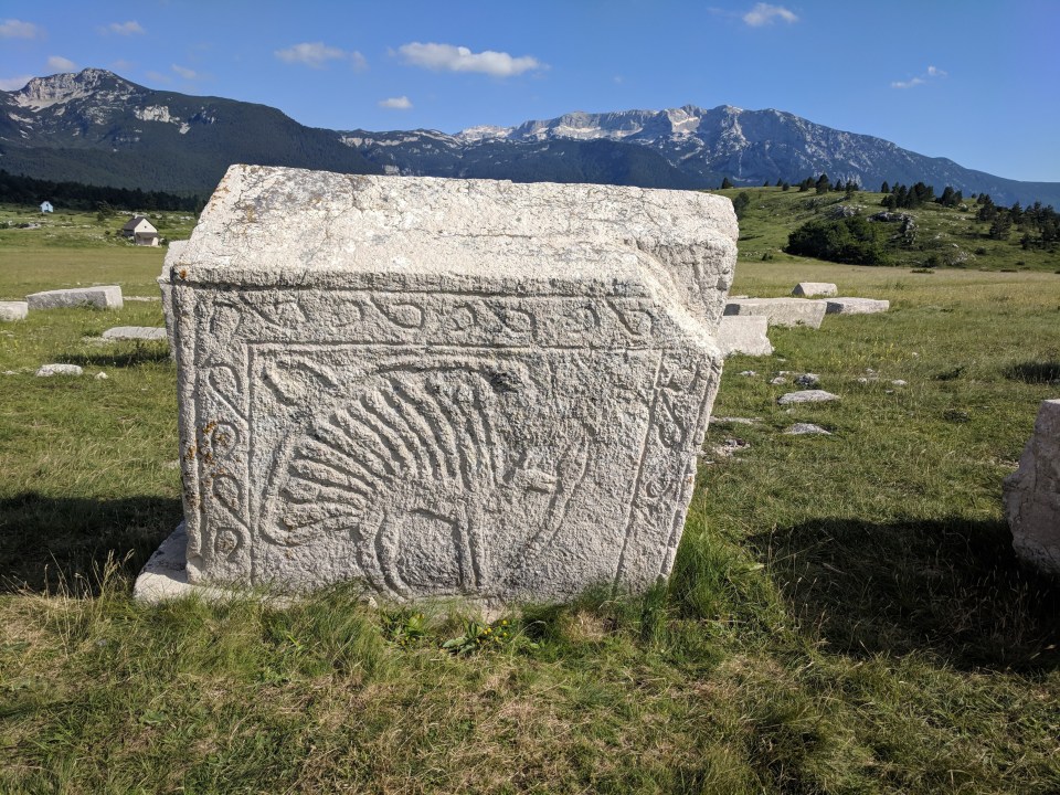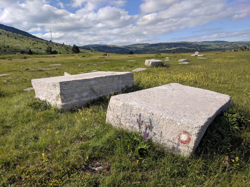 We emerge onto the road tired but happy with our find. It’s a great route down from Veliki Vran, and I’d recommend it to anyone. A few minutes later we reach the roadside necropolis, which is a beautiful jumble of old engraved tombstones.