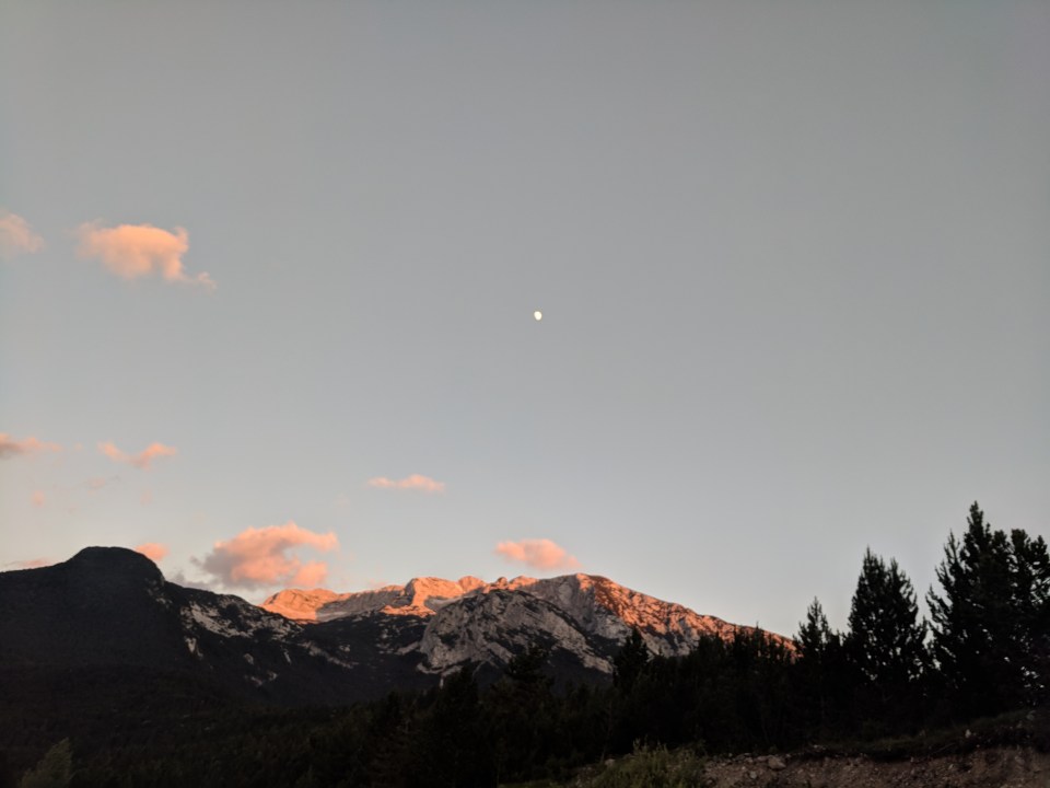 Looking up from our camp at Masna Luka to the moon rising over Čvrsnica mountain (which we’ll climb tomorrow).