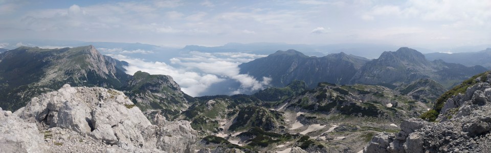 You get a panoramic view of Prenj from up here, impeded only by Zelena glava’s twin peak, Otiš, which is just eighteen metres lower. Just there, poking through the clouds is Cetina, which we climbed yesterday. And there, that’s the mine suspected valley that we spent forever walking around in the rain. Prenj’s limestone peaks froth around us like a choppy sea.