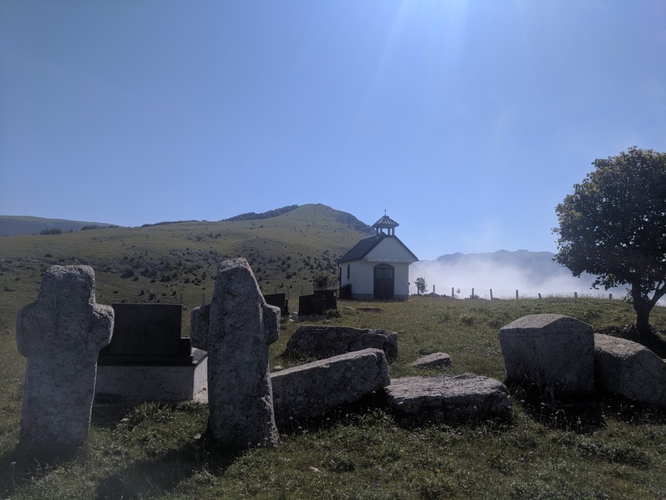 It wasn’t long before we reached the abandoned village of Blace. Like so many other remnants of the recent conflict, it’s hard to find out what happened here. No signs, no memorial, just a lot of ruins and our imagination. It must have been a sizeable town – twenty or so buildings (which is a lot for a mountain top) – but almost all of the old houses had lost their roofs at the very least. The only intact building was a small chapel residing over a cemetery that’s half medieval and half modern. Prehistoric burial mounds lay side by side with modern marble graves in an astonishing display of continuity. A continuity that’s now broken, I guess.