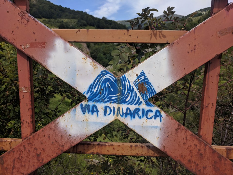 A Via Dinarica sign spray painted on a bridge near Umoljani.