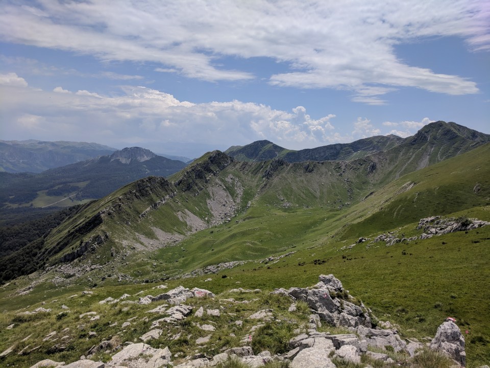 We cut through some gates and fields to approach Visočica and the ridge, with directional advice from some local men fixing a car. It’s a steep climb up, and takes a while. A few clouds appear and I put on my rain gear on instantly, determined not to let all my drying efforts go to waste. But it’s needless – the weather stays warm and beautifully dry.