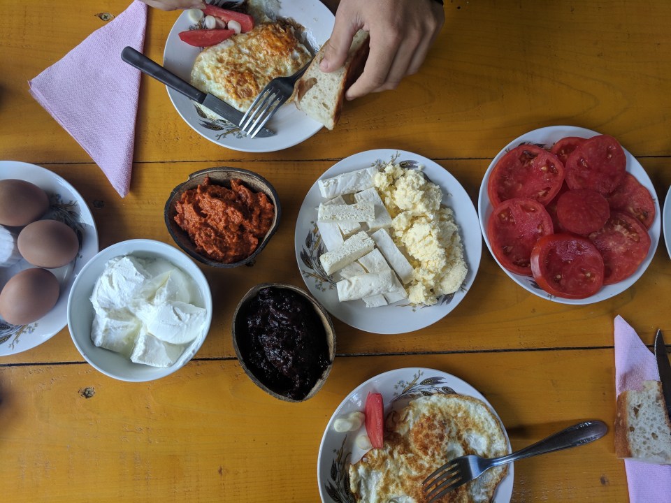 One glance at the spread, and it’s clear that this meal is going to be even better than the last: there’s thick yoghurt, eggs (both boiled and fried), warm bread, plum marmalade, paprika dip, tomato salad and two kinds of cheese. It’s served with herbal tea and, a few minutes later, a mug of hot milk, which presumably comes from the cow munching away outside. I just hope I’m hungry enough to finish it.