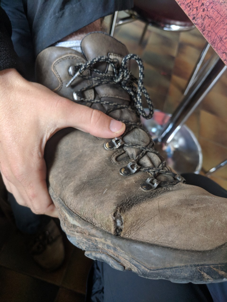 Bags bulging, we head over to the local Russian restaurant to eat a late lunch and deal with another problem: all my gear is falling apart. In addition to my pack frame that broke a few weeks ago, my boots (Scarpa GTX Terras) have developed holes in both sides of both feet. I’ve sent emails to the respective stores from where I bought the gear, however I now find out that both shops have closed! Am I cursed?