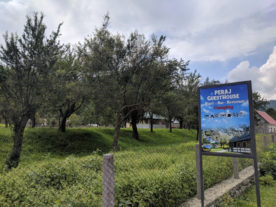 Just before reaching the centre of Vermosh we find the Peraj Guesthouse by the side of the road. Huge old apple trees grow in the garden, bursting with tiny green apples. It’s a garden oasis, ready to save us from the monotonous heat, dust and pebbles. We sit outside under the trees and have some lovely sludgy Turkish coffee. It’s a really relaxing place, owned by a big family whose house forms the main part of the guesthouse. Callum reads his book and I do some writing as the various members of the family potter round, cooking, washing, fixing things and having coffee and, in the case of the small boy, switching between shyly checking us out and repeatedly calling, “Muuuummmmm“. An hour or so later we have lunch – our first, delicious taste of Albanian food is pale green paprika with yoghurt, a tomato salad and homemade fried potatoes. Another hour passes. It’s not a long day, so we can afford the time. There’s no rush.
