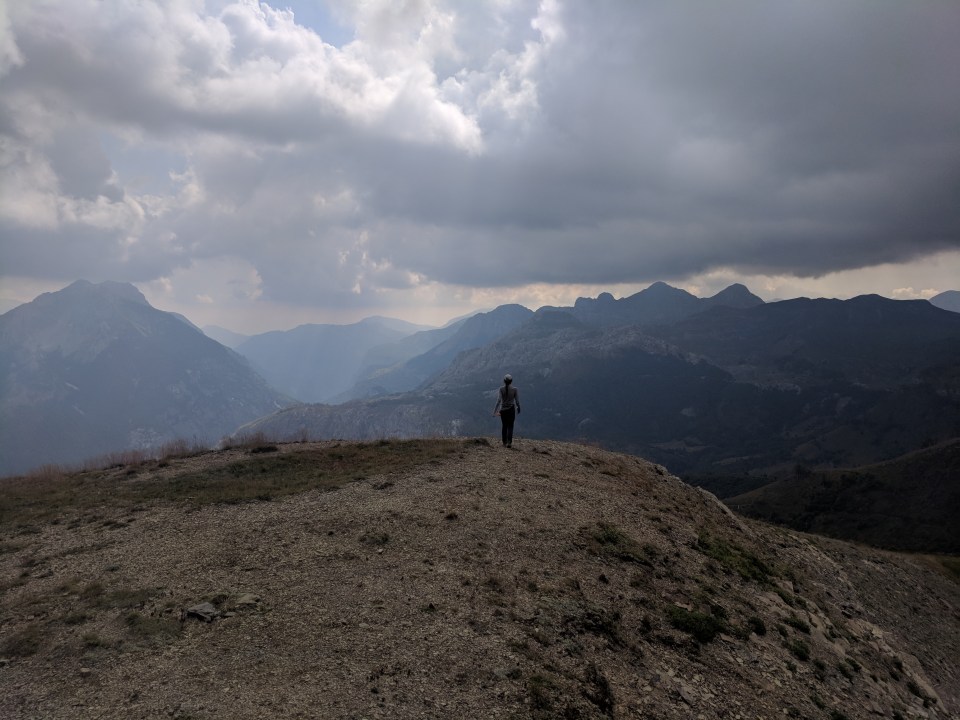 We get a bit lost around the peak but eventually muddle our way up. Greben is a small mountain, but a very good view. Not only can we see back into Montenegro, but down to Lepushë (it looks small and cute) and across to Maja Vajush (a border peak also known as Mount Taljanka that we climb tomorrow in order to slip back into Montenegro). Most impressively, however, are the famous Accursed Mountains (the mountains of Prokletije National Park) which loom to the south. Huge, ancient columns of rock thrust into the sky beyond, these behemoths are the highest mountains in Albania. They look cold. Slate-gray and impenetrable, swathes of ice cracking from their shoulders. I get a little shiver. In a few days, we’ll try to climb the highest one, Maja e Jezercës.
