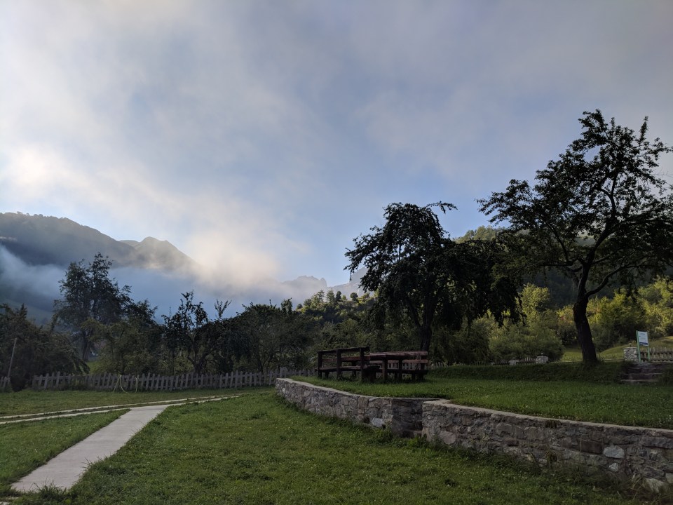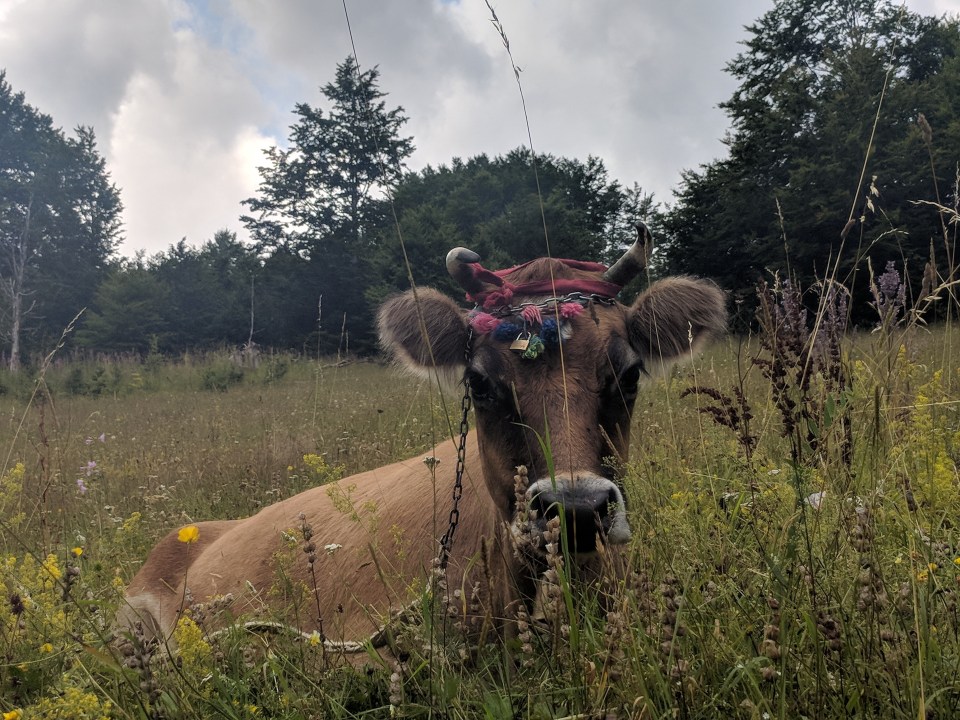 We’re still working off our Trešnejevik debt, so we’re camping on the guesthouse lawn tonight. But it’s a beautiful evening, the grass is luscious and we pitch beneath a few old plum trees. Occasional cows sneak in to munch the grass, which the man who owns the place shoos off with a practiced hand. Dinner is in the house, a quick, simple affair. It’s been a fairly easygoing day what with all our rest stops, but still long and full. Lots of new things. It’s a lot to take in a whole new country as the Via Dinarica draws to a close. But we’ll do our best. Judging from the vibe I got today, I think I’ll like it here just fine.